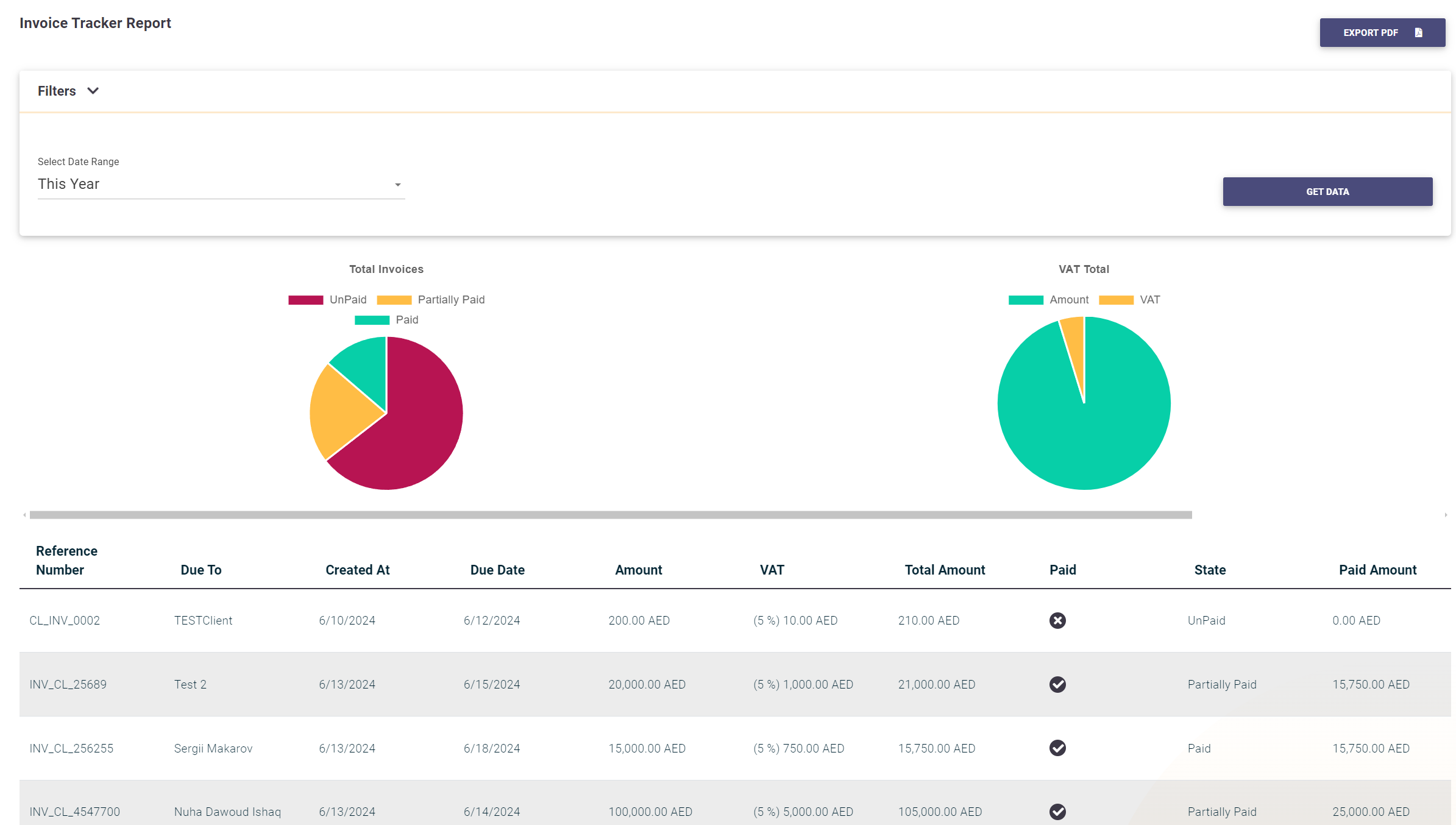 The Invoice Tracker Report is an essential tool for managing and analyzing all issued invoices within the ERP system. This report provides a detailed listing of every invoice, including crucial details such as invoice number, date, client, total amount, VAT, and payment status. By categorizing invoices into Paid, Unpaid, or Partially Paid, the report allows for efficient tracking and management of accounts receivable.