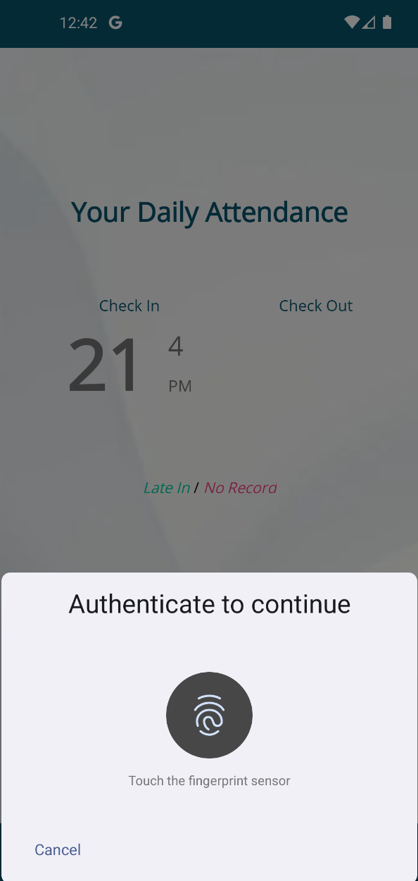 The app provides a simple and efficient way for employees to check in and out for their daily attendance. Using mobile fingerprint authentication and GPS location tracking, employees can ensure that their attendance records are accurate and securely logged.