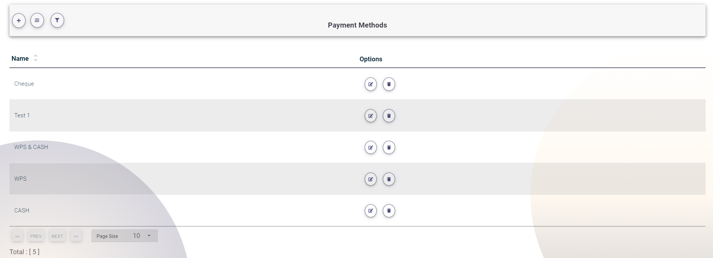- Click on Payment Methods to view the existing list.