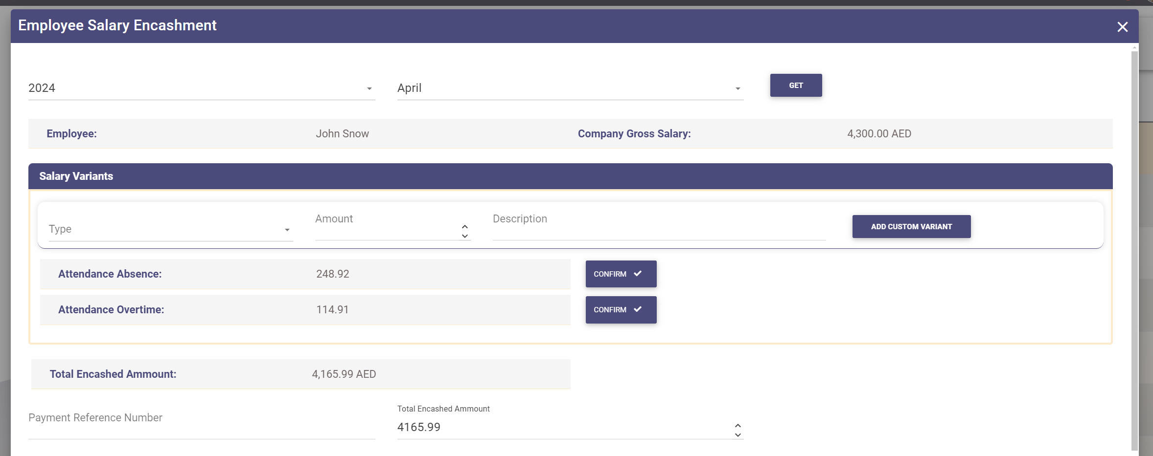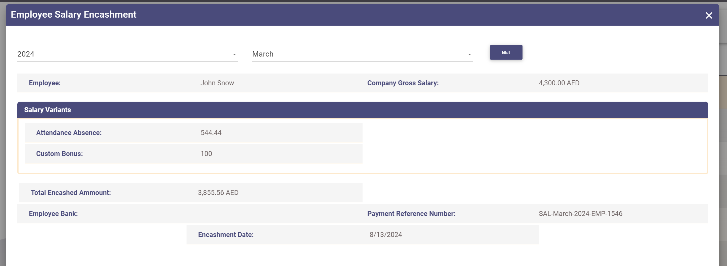 The system will then open a popup where you can select the year and month for the salary encashment: