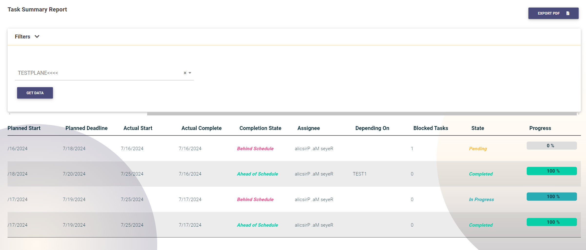 After selecting a plan, the report can be generated with a single click, providing a detailed list of all tasks within that plan. The report displays crucial information, including task names, their creators, planned and actual timelines, assignees, and dependencies. Additionally, it highlights tasks that may be blocking other tasks and provides insights into the overall completion status, whether tasks are ahead of schedule, on time, or behind schedule. This report is a valuable resource for maintaining control over project progress and ensuring that team members are aligned with project goals.