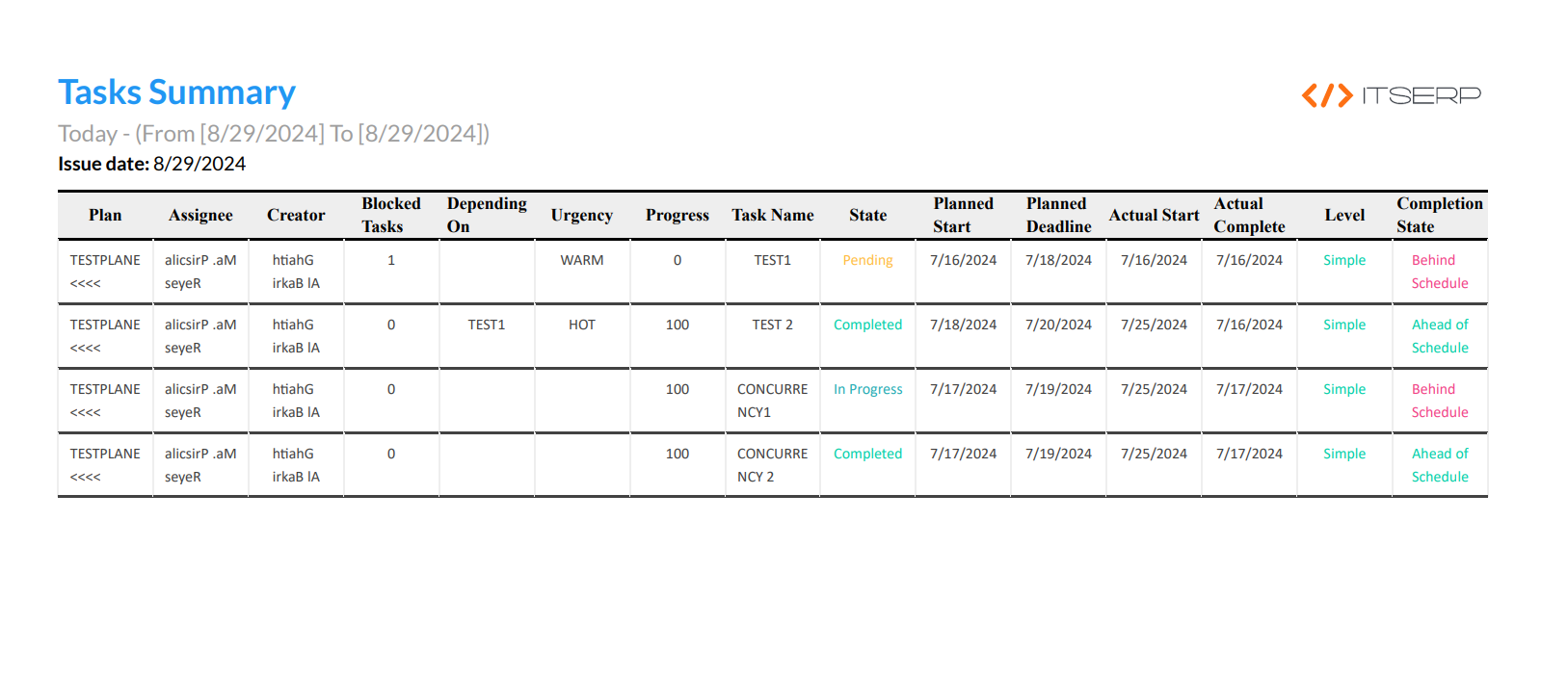 The Tasks Summary Report is an essential tool for project managers and team leaders to gain a comprehensive overview of the tasks within a selected plan. This report provides detailed information on each task, allowing for easy tracking of progress and identification of potential bottlenecks. By summarizing key details such as start and end dates, task dependencies, and completion status, the Tasks Summary Report ensures that project timelines are adhered to and tasks are completed efficiently.