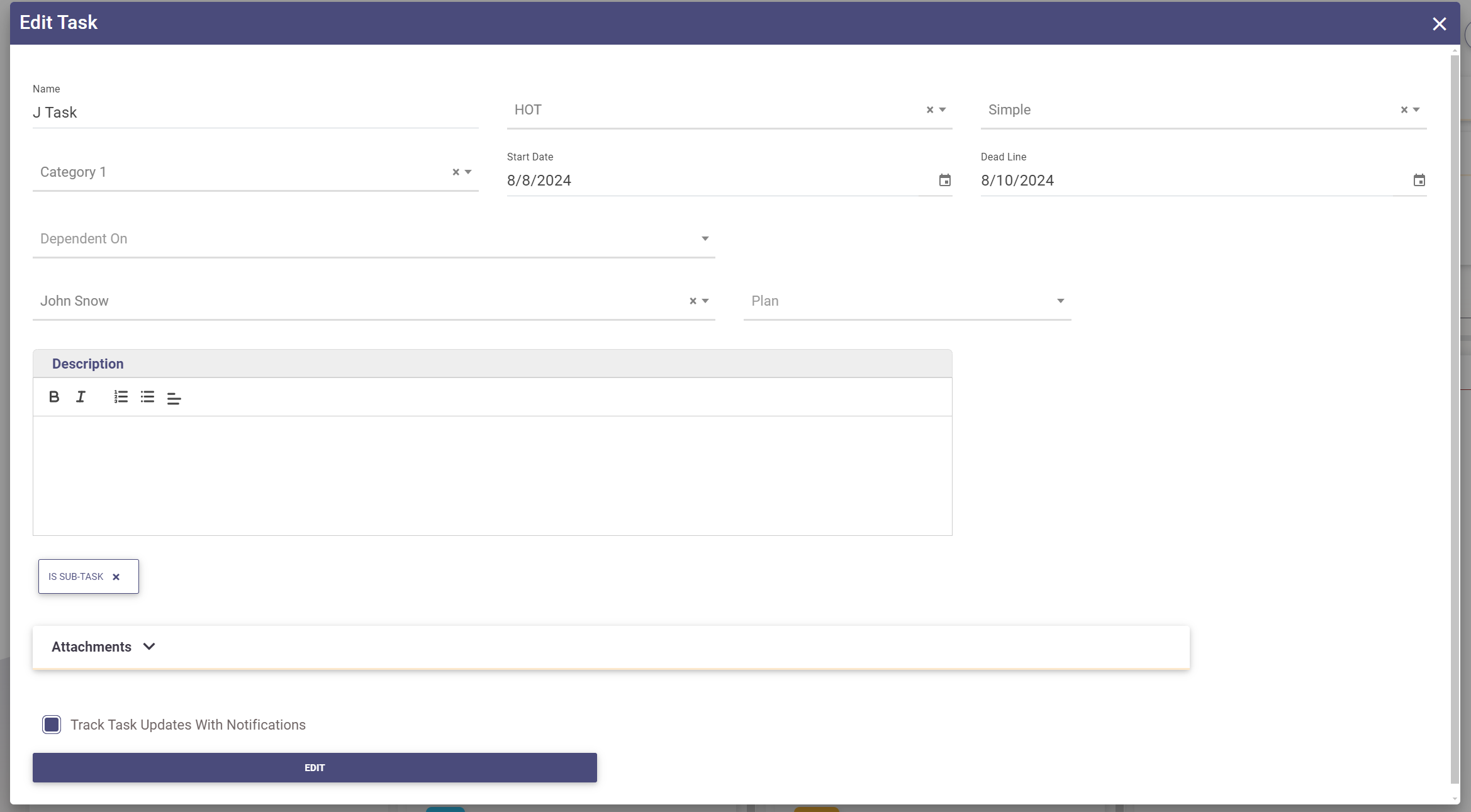 - Start Date and Deadline: Set the start date and deadline for the task.