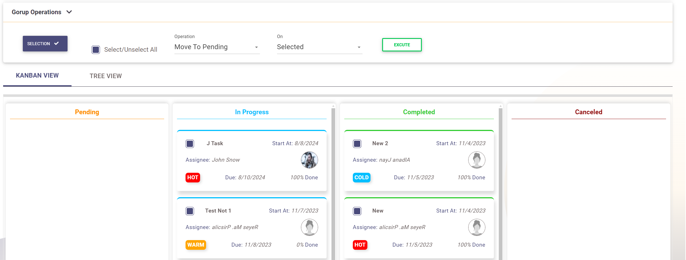 - Group Operations: For bulk task management, expand the group operation panel and click on the "Selection" button. This action enables checkboxes on each task, allowing you to select multiple tasks at once. You can then perform bulk operations on the selected or non-selected tasks, such as: