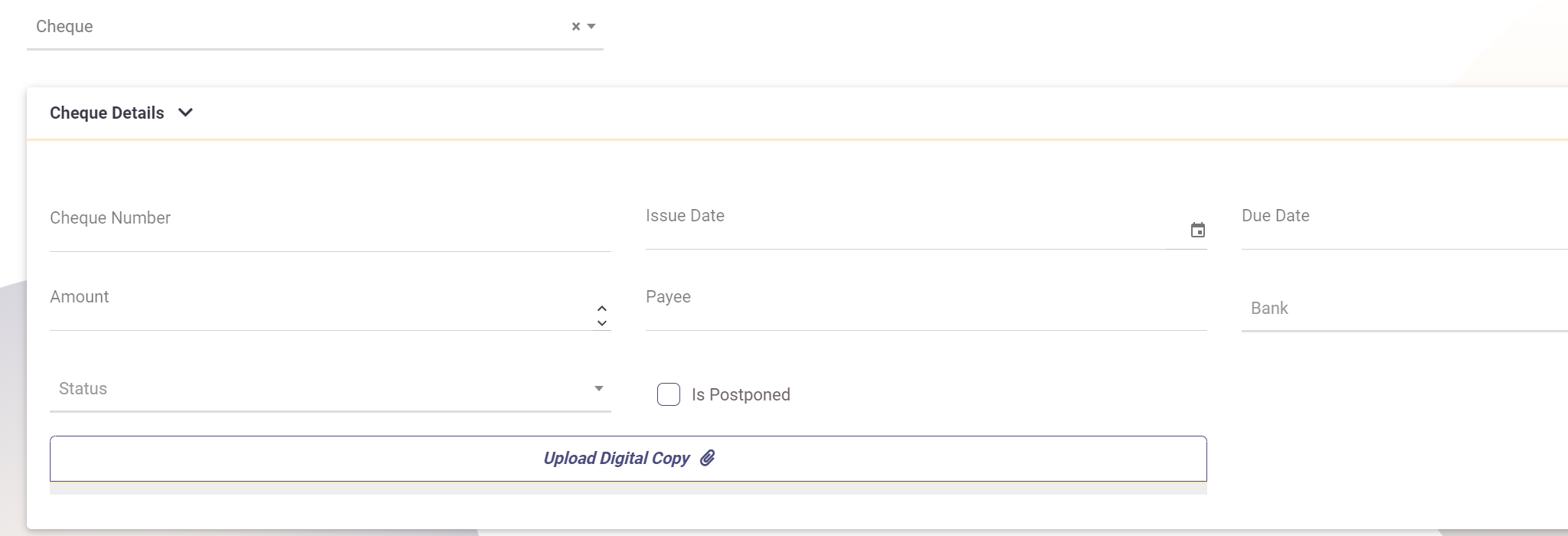 When a Cheque is selected as the Payment Method , the system will open a panel to fill in the cheque details, ensuring all necessary information is captured for tracking and auditing purposes.