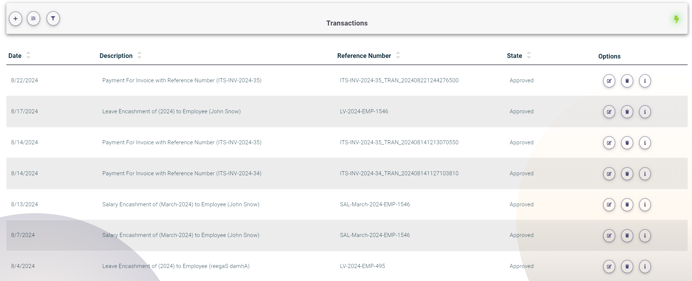 The system opens the Create Transaction panel automatically every time a payment occurs, such as Salary Encashments, Leave Encashments, or Invoice payments. Additionally, accountants can manually add a transaction by clicking the plus (+) icon at the top of the Transactions Pages.