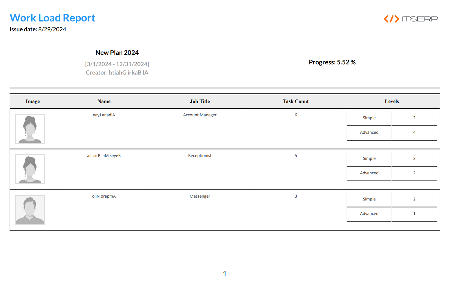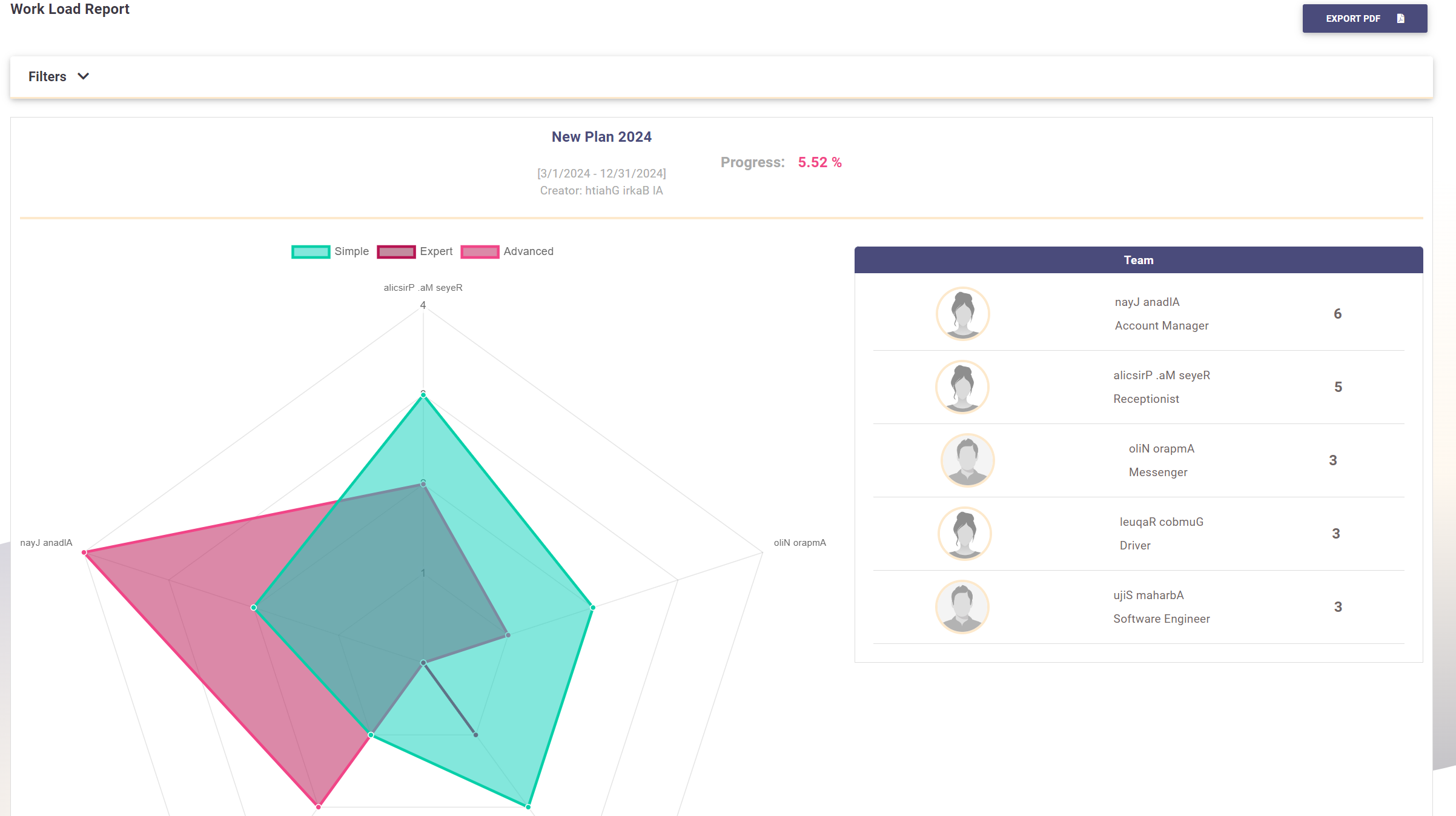 By starting with the selection of a plan, the system will display essential details such as the creator of the plan and the overall completeness percentage. Additionally, the report breaks down the tasks by complexity level (Expert, Advanced, Complex, Intermediate, Simple) and shows how these tasks are allocated among the team members. The Work Load Report is a valuable resource for optimizing team performance and ensuring that all tasks are managed effectively.